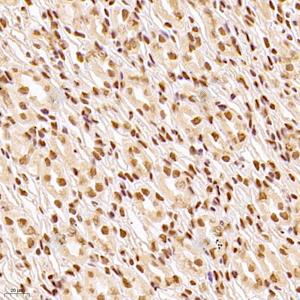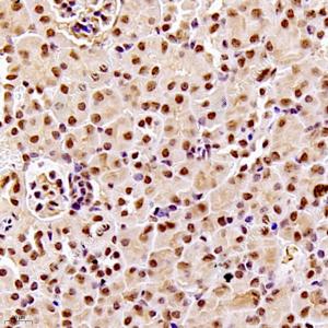 IHC检测ROR alpha/RORA蛋白(货号 GB121300). 样品: 大鼠肾, 4%多聚甲醛 (货号G1101) 固定12-24小时. 抗原修复: 柠檬酸抗原修复液(干粉, pH 6.0) (G1201), 高压锅均匀喷气计时2分钟. —抗: 1: 900稀释, 4℃ 孵育过夜. 二抗: HRP标记山羊抗小鼠IgG (H+L) (货号GB23301), 1: 200稀释, 室温孵育1小时. |