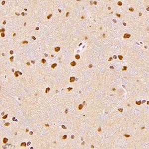 IHC检测ROR alpha/RORA蛋白(货号 GB121300). 样品: 大鼠脑, 4%多聚甲醛 (货号G1101) 固定12-24小时. 抗原修复: 柠檬酸抗原修复液(干粉, pH 6.0) (G1201), 高压锅均匀喷气计时2分钟. —抗: 1: 900稀释, 4℃ 孵育过夜. 二抗: HRP标记山羊抗小鼠IgG (H+L) (货号GB23301), 1: 200稀释, 室温孵育1小时. |