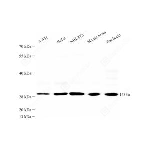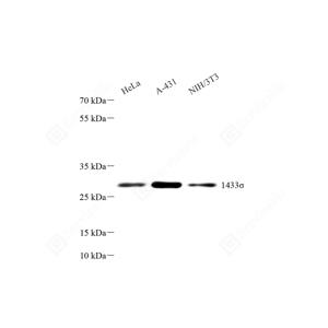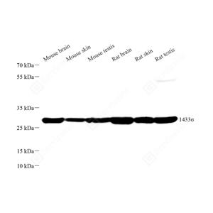 WB检测14-3-3 zeta蛋白(货号 GB115555). 样品: 经RIPA裂解液(货号G2002)处理的蛋白质. 封闭: 封闭: 3%脱脂牛奶(货号GC310001)溶于TBST溶液, 室温孵育1小时. —抗: 1: 300稀释, 4℃ 孵育过夜. 二抗: HRP标记山羊抗兔IgG (H+L) (货号GB23303), 1: 5000稀释, 室温孵育1小时. |