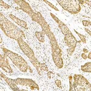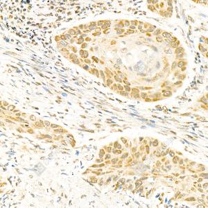 IHC检测TPX2蛋白(货号 GB111226). 样品: 人肺癌, 4%多聚甲醛 (货号G1101) 固定12-24小时. 抗原修复: 柠檬酸抗原修复液(干粉, pH 6.0) (G1201), 98℃, 20分钟. —抗: 1: 200稀释, 4℃ 孵育过夜. 二抗: HRP标记山羊抗兔IgG (H+L) (货号GB23303), 1: 200稀释, 室温孵育1小时. |