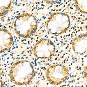 IHC检测TPX2蛋白(货号 GB111226). 样品: 人结肠, 4%多聚甲醛 (货号G1101) 固定12-24小时. 抗原修复: 柠檬酸抗原修复液(干粉, pH 6.0) (G1201), 98℃, 20分钟. —抗: 1: 200稀释, 4℃ 孵育过夜. 二抗: HRP标记山羊抗兔IgG (H+L) (货号GB23303), 1: 200稀释, 室温孵育1小时. |