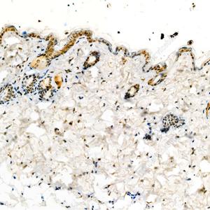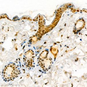 IHC检测TPX2蛋白(货号 GB111226). 样品: 小鼠皮肤, 4%多聚甲醛 (货号G1101) 固定12-24小时. 抗原修复: 柠檬酸抗原修复液(干粉, pH 6.0) (G1201), 98℃, 20分钟. —抗: 1: 200稀释, 4℃ 孵育过夜. 二抗: HRP标记山羊抗兔IgG (H+L) (货号GB23303), 1: 200稀释, 室温孵育1小时. |