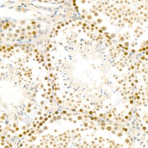 IHC检测TPX2蛋白(货号 GB111226). 样品: 小鼠睾丸, 4%多聚甲醛 (货号G1101) 固定12-24小时. 抗原修复: 柠檬酸抗原修复液(干粉, pH 6.0) (G1201), 98℃, 20分钟. —抗: 1: 200稀释, 4℃ 孵育过夜. 二抗: HRP标记山羊抗兔IgG (H+L) (货号GB23303), 1: 200稀释, 室温孵育1小时. |