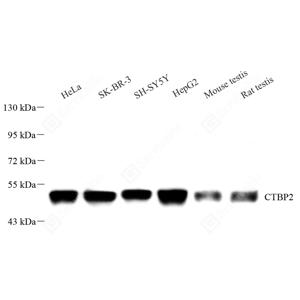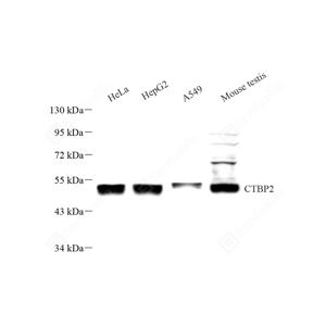 WB检测CTBP2蛋白(货号 GB113724). 样品: 经RIPA裂解液(货号G2002)处理的蛋白质. 封闭: 3%脱脂牛奶(货号GC310001)溶于TBST溶液, 室温孵育1小时. —抗: 1: 600稀释, 4℃ 孵育过夜. 二抗: HRP标记山羊抗兔IgG (H+L) (货号GB23303), 1: 5000稀释, 室温孵育1小时. |