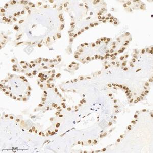 IHC检测CTBP2蛋白(货号 GB113724). 样品: 人甲状腺, 4%多聚甲醛 (货号G1101) 固定12-24小时. 抗原修复: Tris-EDTA抗原修复液(pH 9.0) (G1203), 98℃, 20分钟. —抗: 1: 1600稀释, 4℃ 孵育过夜. 二抗: HRP标记山羊抗兔IgG (H+L) (货号GB23303), 1: 200稀释, 室温孵育1小时. |