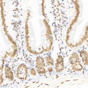 IHC检测CTBP2蛋白(货号 GB113724). 样品: 小鼠十二指肠, 4%多聚甲醛 (货号G1101) 固定12-24小时. 抗原修复: Tris-EDTA抗原修复液(pH 9.0) (G1203), 98℃, 20分钟. —抗: 1: 1600稀释, 4℃ 孵育过夜. 二抗: HRP标记山羊抗兔IgG (H+L) (货号GB23303), 1: 200稀释, 室温孵育1小时. |