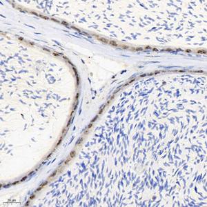 IHC检测HIPK1蛋白(货号 GB113479). 样品: 小鼠附睾, 4%多聚甲醛 (货号G1101) 固定12-24小时. 抗原修复: 柠檬酸抗原修复液(干粉, pH 6.0) (G1201), 98℃, 20分钟. —抗: 1: 300稀释, 4℃ 孵育过夜. 二抗: HRP标记山羊抗兔IgG (H+L) (货号GB23303), 1: 200稀释, 室温孵育1小时. |