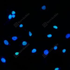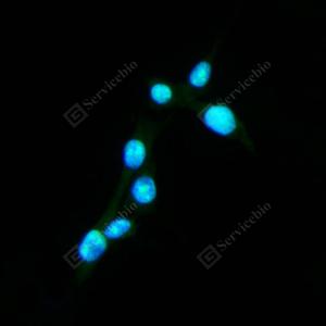 ICC检测PSME3蛋白(货号 GB113794)(绿色). 样品: NIH-3T3细胞, 4%多聚甲醛 (货号G1101) 固定20分钟. 封闭: 3% BSA(货号GC305010)的PBS溶液, 室温孵育30分钟. —抗: 1: 200稀释, 4℃ 孵育过夜. 二抗: Alexa Fluor 488标记山羊抗兔IgG (H+L) (货号GB25303), 1: 400稀释, 室温孵育1小时. |