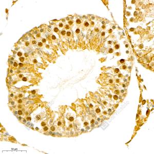 IHC检测RRAGC蛋白(货号 GB111319). 样品: 小鼠睾丸, 4%多聚甲醛 (货号G1101) 固定12-24小时. 抗原修复: 柠檬酸抗原修复液(干粉, pH 6.0) (G1201), 98℃, 20分钟. —抗: 1: 2000稀释, 4℃ 孵育过夜. 二抗: HRP标记山羊抗兔IgG (H+L) (货号GB23303), 1: 200稀释, 室温孵育1小时. |