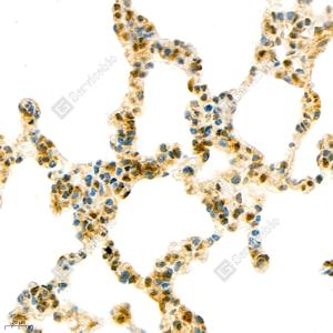 IHC检测RRAGC蛋白(货号 GB111319). 样品: 小鼠肺, 4%多聚甲醛 (货号G1101) 固定12-24小时. 抗原修复: 柠檬酸抗原修复液(干粉, pH 6.0) (G1201), 98℃, 20分钟. —抗: 1: 2000稀释, 4℃ 孵育过夜. 二抗: HRP标记山羊抗兔IgG (H+L) (货号GB23303), 1: 200稀释, 室温孵育1小时. |