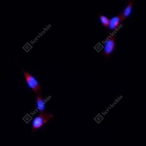 ICC检测RRAGC蛋白(货号 GB111319)(红色). 样品: Hela细胞, 4%多聚甲醛 (货号G1101) 固定20分钟. 封闭: 3% BSA(货号GC305010)的PBS溶液, 室温孵育30分钟. —抗: 1: 100稀释, 4℃ 孵育过夜. 二抗: Cy3标记山羊抗兔IgG (H+L) (货号GB21303), 1: 300稀释, 室温孵育1小时. |