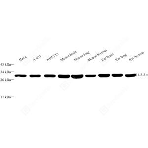 WB检测14-3-3 Tau蛋白(货号 GB111166). 样品: 经RIPA裂解液(货号G2002)处理的蛋白质. 封闭: 封闭: 3%脱脂牛奶(货号GC310001)溶于TBST溶液, 室温孵育1小时. —抗: 1: 500稀释, 4℃ 孵育过夜. 二抗: HRP标记山羊抗兔IgG (H+L) (货号GB23303), 1: 5000稀释, 室温孵育1小时. |