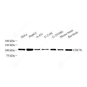 | WB检测Cdc5L蛋白(货号 GB111527). 样品: 经RIPA裂解液(货号G2002)处理的蛋白质. 封闭: 封闭: 3%脱脂牛奶(货号GC310001)溶于TBST溶液, 室温孵育1小时. —抗: 1: 500稀释, 4℃ 孵育过夜. 二抗: HRP标记山羊抗兔IgG (H+L) (货号GB23303), 1: 5000稀释, 室温孵育1小时. |