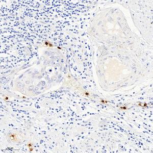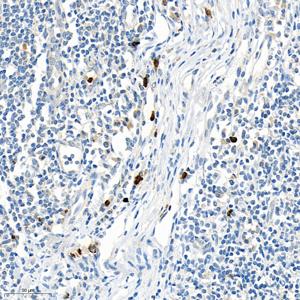 IHC检测CDKN2A/p14ARF蛋白(货号 GB115589). 样品: 人扁桃体, 4%多聚甲醛 (货号G1101) 固定12-24小时. 抗原修复: Tris-EDTA抗原修复液(pH 9.0) (G1203), 98℃, 20分钟. —抗: 1: 200稀释, 4℃ 孵育过夜. 二抗: HRP标记山羊抗兔IgG (H+L) (货号GB23303), 1: 200稀释, 室温孵育1小时. |