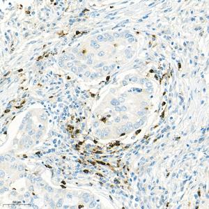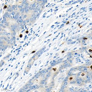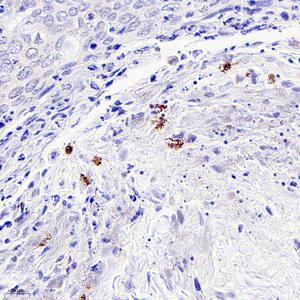 IHC检测CDKN2A/p14ARF蛋白(货号 GB115589). 样品: 人宫颈癌, 4%多聚甲醛 (货号G1101) 固定12-24小时. 抗原修复: Tris-EDTA抗原修复液(pH 9.0) (G1203), 98℃, 20分钟. —抗: 1: 200稀释, 4℃ 孵育过夜. 二抗: HRP标记山羊抗兔IgG (H+L) (货号GB23303), 1: 200稀释, 室温孵育1小时. |