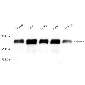 WB检测CNNM2蛋白(货号 GB111835). 样品: 经RIPA裂解液(货号G2002)处理的蛋白质. 封闭: 封闭: 3%脱脂牛奶(货号GC310001)溶于TBST溶液, 室温孵育1小时. —抗: 1: 1000稀释, 4℃ 孵育过夜. 二抗: HRP标记山羊抗兔IgG (H+L) (货号GB23303), 1: 5000稀释, 室温孵育1小时. |