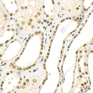 IHC检测MTBP蛋白(货号 GB114421). 样品: 人肾, 4%多聚甲醛 (货号G1101) 固定12-24小时. 抗原修复: 柠檬酸抗原修复液(干粉, pH 6.0) (G1201), 98℃, 20分钟. —抗: 1: 1000稀释, 4℃ 孵育过夜. 二抗: HRP标记山羊抗兔IgG (H+L) (货号GB23303), 1: 200稀释, 室温孵育1小时. |