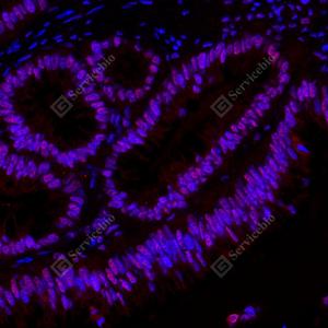 IF检测MTBP蛋白(货号 GB114421)(红色). 样品: 人结肠癌, 4%多聚甲醛 (货号G1101) 固定12-24小时. 抗原修复: Tris-EDTA抗原修复液(pH 9.0) (G1203), 98℃, 20分钟. 封闭: 3% BSA(货号GC305010)的PBS溶液, 室温孵育30分钟. —抗: 1: 1000稀释, 4℃ 孵育过夜. 二抗: Cy3标记山羊抗兔IgG (H+L) (货号GB21303), 1: 300稀释, 室温孵育1小时. |