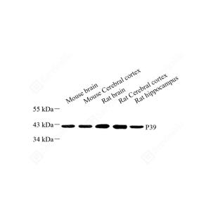 WB检测p39蛋白(货号 GB11792). 样品: 经RIPA裂解液(货号G2002)处理的蛋白质. 封闭: 3%脱脂牛奶(货号GC310001)溶于TBST溶液, 室温孵育1小时. —抗: 1: 1000稀释, 4℃ 孵育过夜. 二抗: HRP标记山羊抗兔IgG (H+L) (货号GB23303), 1: 5000稀释, 室温孵育1小时. |