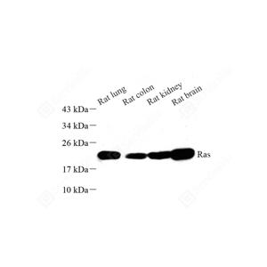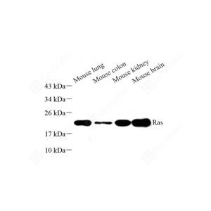 WB检测Ras蛋白(货号 GB11411). 样品: 经RIPA裂解液(货号G2002)处理的蛋白质. 封闭: 封闭: 3%脱脂牛奶(货号GC310001)溶于TBST溶液, 室温孵育1小时. —抗: 1: 800稀释, 4℃ 孵育过夜. 二抗: HRP标记山羊抗兔IgG (H+L) (货号GB23303), 1: 5000稀释, 室温孵育1小时. |