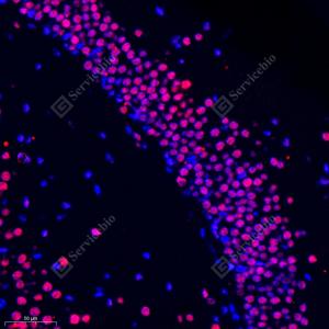 | IF检测RanBP16蛋白(货号 GB112744)(红色). 样品: 小鼠黑质, 4%多聚甲醛 (货号G1101) 固定12-24小时. 抗原修复: Tris-EDTA抗原修复液(pH 9.0) (G1203), 98℃, 20分钟. 封闭: 3% BSA(货号GC305010)的PBS溶液, 室温孵育30分钟. —抗: 1: 300稀释, 4℃ 孵育过夜. 二抗: Cy3标记山羊抗兔IgG (H+L) (货号GB21303), 1: 300稀释, 室温孵育1小时. |