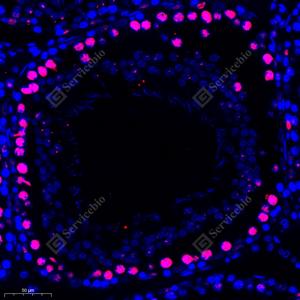 | IF检测RanBP16蛋白(货号 GB112744)(红色). 样品: 小鼠睾丸, 4%多聚甲醛 (货号G1101) 固定12-24小时. 抗原修复: Tris-EDTA抗原修复液(pH 9.0) (G1203), 98℃, 20分钟. 封闭: 3% BSA(货号GC305010)的PBS溶液, 室温孵育30分钟. —抗: 1: 300稀释, 4℃ 孵育过夜. 二抗: Cy3标记山羊抗兔IgG (H+L) (货号GB21303), 1: 300稀释, 室温孵育1小时. |