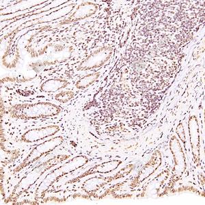 | IHC检测RanBP16蛋白(货号 GB112744). 样品: 大鼠结肠, 4%多聚甲醛 (货号G1101) 固定12-24小时. 抗原修复: 柠檬酸抗原修复液(干粉, pH 6.0) (G1201), 98℃, 20分钟. —抗: 1: 300稀释, 4℃ 孵育过夜. 二抗: HRP标记山羊抗兔IgG (H+L) (货号GB23303), 1: 200稀释, 室温孵育1小时. |