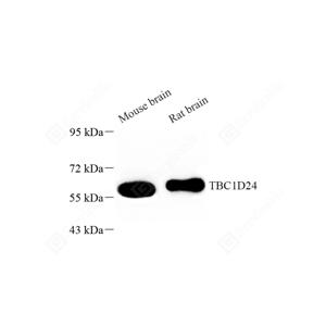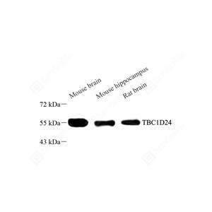 WB检测TBC1D24蛋白(货号 GB112801). 样品: 经RIPA裂解液(货号G2002)处理的蛋白质. 封闭: 封闭: 3%脱脂牛奶(货号GC310001)溶于TBST溶液, 室温孵育1小时. —抗: 1: 1000稀释, 4℃ 孵育过夜. 二抗: HRP标记山羊抗兔IgG (H+L) (货号GB23303), 1: 5000稀释, 室温孵育1小时. |