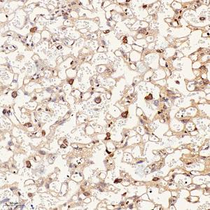IHC检测ARL6IP6蛋白(货号 GB115199). 样品: 大鼠胎盘, 4%多聚甲醛 (货号G1101) 固定12-24小时. 抗原修复: Tris-EDTA抗原修复液(pH 9.0) (G1203), 98℃, 20分钟. —抗: 1: 700稀释, 4℃ 孵育过夜. 二抗: HRP标记山羊抗兔IgG (H+L) (货号GB23303), 1: 200稀释, 室温孵育1小时. |