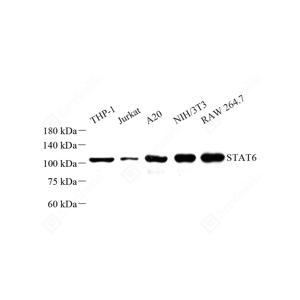 WB检测STAT6蛋白(货号 GB111381). 样品: 经RIPA裂解液(货号G2002)处理的蛋白质. 封闭: 封闭: 3%脱脂牛奶(货号GC310001)溶于TBST溶液, 室温孵育1小时. —抗: 1: 500稀释, 4℃ 孵育过夜. 二抗: HRP标记山羊抗兔IgG (H+L) (货号GB23303), 1: 5000稀释, 室温孵育1小时. |