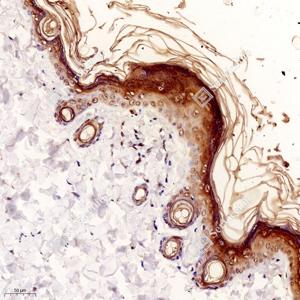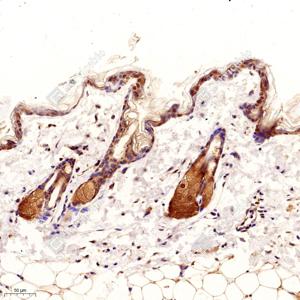 IHC检测Nck-2蛋白(货号 GB11900). 样品: 小鼠皮肤, 4%多聚甲醛 (货号G1101) 固定12-24小时. 抗原修复: 柠檬酸抗原修复液(干粉, pH 6.0) (G1201), 98℃, 20分钟. —抗: 1: 2000稀释, 4℃ 孵育过夜. 二抗: HRP标记山羊抗兔IgG (H+L) (货号GB23303), 1: 200稀释, 室温孵育1小时. |