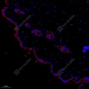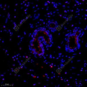 IF检测Nck-2蛋白(货号 GB11900)(红色). 样品: 小鼠皮肤, 4%多聚甲醛 (货号G1101) 固定12-24小时. 抗原修复: Tris-EDTA抗原修复液(pH 9.0) (G1203), 98℃, 20分钟. 封闭: 3% BSA(货号GC305010)的PBS溶液, 室温孵育30分钟. —抗: 1: 1000稀释, 4℃ 孵育过夜. 二抗: Cy3标记山羊抗兔IgG (H+L) (货号GB21303), 1: 300稀释, 室温孵育1小时. |