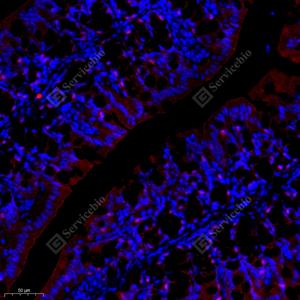 IF检测Nck-2蛋白(货号 GB11900)(红色). 样品: 小鼠结肠, 4%多聚甲醛 (货号G1101) 固定12-24小时. 抗原修复: Tris-EDTA抗原修复液(pH 9.0) (G1203), 98℃, 20分钟. 封闭: 3% BSA(货号GC305010)的PBS溶液, 室温孵育30分钟. —抗: 1: 1000稀释, 4℃ 孵育过夜. 二抗: Cy3标记山羊抗兔IgG (H+L) (货号GB21303), 1: 300稀释, 室温孵育1小时. |