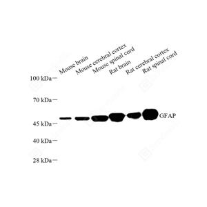 WB检测GFAP蛋白(货号 GB12096). 样品: 经RIPA裂解液(货号G2002)处理的蛋白质. 封闭: 3%脱脂牛奶(货号GC310001)溶于TBST溶液, 室温孵育1小时. —抗: 1: 5000稀释, 4℃ 孵育过夜. 二抗: HRP标记山羊抗小鼠IgG (H+L) (货号GB23301), 1: 5000稀释, 室温孵育1小时. |