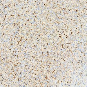 IHC检测GFAP蛋白(货号 GB12096). 样品: 人多形性胶质母细胞瘤, 4%多聚甲醛 (货号G1101) 固定12-24小时. 抗原修复: 柠檬酸抗原修复液(干粉, pH 6.0) (G1201), 98℃, 20分钟. —抗: 1: 500稀释, 4℃ 孵育过夜. 二抗: HRP标记山羊抗小鼠IgG (H+L) (货号GB23301), 1: 200稀释, 室温孵育1小时. |