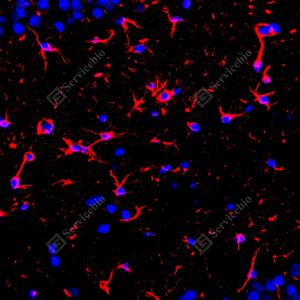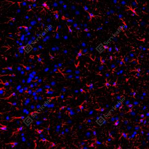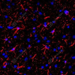 IF检测GFAP蛋白(货号 GB12096)(红色). 样品: 小鼠脑, 4%多聚甲醛 (货号G1101) 固定12-24小时. 抗原修复: Tris-EDTA抗原修复液(pH 9.0) (G1203), 98℃, 20分钟. 封闭: 3% BSA(货号GC305010)的PBS溶液, 室温孵育30分钟. —抗: 1: 1000稀释, 4℃ 孵育过夜. 二抗: Cy3标记山羊抗小鼠IgG (H+L) (货号GB21301), 1: 300稀释, 室温孵育1小时. |