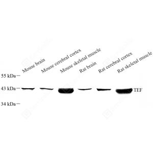 TEF (thyrotrophic embryonic factor), also known as KIAA1655, is a 303 amino acid nuclear transcription factor that belongs to the bZIP (basic region/leucine zipper) family and PAR (proline and acidic amino acid-rich) subfamily. TEF binds DNA as either a homodimer or heterodimer, and is known to transactivate the TSH beta promoter. While broadly expressed in adults, TEF is only found in developing embryonic anterior pituitary gland.