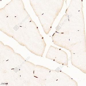 IHC检测Thyrotroph embryonic factor蛋白(货号 GB111653). 样品: 小鼠骨骼肌, 4%多聚甲醛 (货号G1101) 固定12-24小时. 抗原修复: Tris-EDTA抗原修复液(pH 9.0) (G1203), 98℃, 20分钟. —抗: 1: 700稀释, 4℃ 孵育过夜. 二抗: HRP标记山羊抗兔IgG (H+L) (货号GB23303), 1: 200稀释, 室温孵育1小时. |