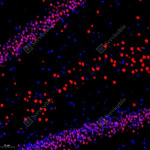 IF检测Thyrotroph embryonic factor蛋白(货号 GB111653)(红色). 样品: 大鼠脑, 4%多聚甲醛 (货号G1101) 固定12-24小时. 抗原修复: Tris-EDTA抗原修复液(pH 9.0) (G1203), 98℃, 20分钟. 封闭: 3% BSA(货号GC305010)的PBS溶液, 室温孵育30分钟. —抗: 1: 700稀释, 4℃ 孵育过夜. 二抗: Cy3标记山羊抗兔IgG (H+L) (货号GB21303), 1: 300稀释, 室温孵育1小时. |
