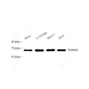 WB检测WDR20蛋白(货号 GB112783). 样品: 经RIPA裂解液(货号G2002)处理的蛋白质. 封闭: 封闭: 3%脱脂牛奶(货号GC310001)溶于TBST溶液, 室温孵育1小时. —抗: 1: 1000稀释, 4℃ 孵育过夜. 二抗: HRP标记山羊抗兔IgG (H+L) (货号GB23303), 1: 5000稀释, 室温孵育1小时. |