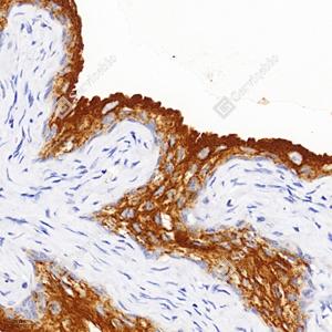 IHC检测Uroplakin Ib/UPIb蛋白(货号 GB113490). 样品: 小鼠膀胱, 4%多聚甲醛 (货号G1101) 固定12-24小时. 抗原修复: 柠檬酸抗原修复液(干粉, pH 6.0) (G1201), 98℃, 20分钟. —抗: 1: 2000稀释, 4℃ 孵育过夜. 二抗: HRP标记山羊抗兔IgG (H+L) (货号GB23303), 1: 200稀释, 室温孵育1小时. |