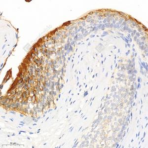 IHC检测Uroplakin Ib/UPIb蛋白(货号 GB113490). 样品: 大鼠膀胱, 4%多聚甲醛 (货号G1101) 固定12-24小时. 抗原修复: 柠檬酸抗原修复液(干粉, pH 6.0) (G1201), 98℃, 20分钟. —抗: 1: 2000稀释, 4℃ 孵育过夜. 二抗: HRP标记山羊抗兔IgG (H+L) (货号GB23303), 1: 200稀释, 室温孵育1小时. |