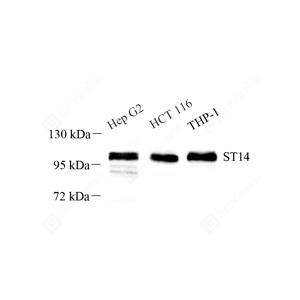 Suppression of tumorigenicity 14(ST14), is an epithelial-derived, integral membrane serine protease. ST14 forms a complex with the Kunitz-type serine protease inhibitor, HAI-1, and is found to be activated by sphingosine 1-phosphate. ST14 can cleave and activate hepatocyte growth factor/scattering factor, and uPA, which suggest the function of this protease as an epithelial membrane activator for other proteases and latent growth factors.