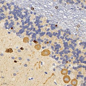 IHC检测Artemin蛋白(货号 GB113614). 样品: 大鼠小脑, 4%多聚甲醛 (货号G1101) 固定12-24小时. 抗原修复: 柠檬酸抗原修复液(干粉, pH 6.0) (G1201), 98℃, 20分钟. —抗: 1: 2000稀释, 4℃ 孵育过夜. 二抗: HRP标记山羊抗兔IgG (H+L) (货号GB23303), 1: 200稀释, 室温孵育1小时. |