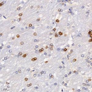 IHC检测Artemin蛋白(货号 GB113614). 样品: 大鼠纹状体, 4%多聚甲醛 (货号G1101) 固定12-24小时. 抗原修复: 柠檬酸抗原修复液(干粉, pH 6.0) (G1201), 98℃, 20分钟. —抗: 1: 2000稀释, 4℃ 孵育过夜. 二抗: HRP标记山羊抗兔IgG (H+L) (货号GB23303), 1: 200稀释, 室温孵育1小时. |