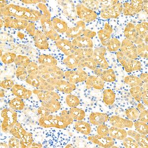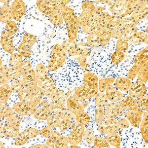IHC检测CNDP2/CN2蛋白(货号 GB113930). 样品: 人肾, 4%多聚甲醛 (货号G1101) 固定12-24小时. 抗原修复: 柠檬酸抗原修复液(干粉, pH 6.0) (G1201), 98℃, 20分钟. —抗: 1: 700稀释, 4℃ 孵育过夜. 二抗: HRP标记山羊抗兔IgG (H+L) (货号GB23303), 1: 200稀释, 室温孵育1小时. |