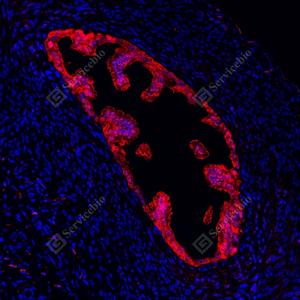 IF检测CNDP2/CN2蛋白(货号 GB113930)(红色). 样品: 小鼠卵巢, 4%多聚甲醛 (货号G1101) 固定12-24小时. 抗原修复: Tris-EDTA抗原修复液(pH 9.0) (G1203), 98℃, 20分钟. 封闭: 3% BSA(货号GC305010)的PBS溶液, 室温孵育30分钟. —抗: 1: 500稀释, 4℃ 孵育过夜. 二抗: Cy3标记山羊抗兔IgG (H+L) (货号GB21303), 1: 300稀释, 室温孵育1小时. |