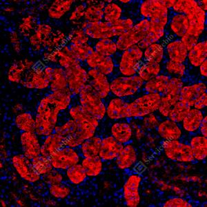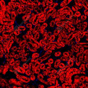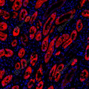 IF检测CNDP2/CN2蛋白(货号 GB113930)(红色). 样品: 人肾, 4%多聚甲醛 (货号G1101) 固定12-24小时. 抗原修复: Tris-EDTA抗原修复液(pH 9.0) (G1203), 98℃, 20分钟. 封闭: 3% BSA(货号GC305010)的PBS溶液, 室温孵育30分钟. —抗: 1: 500稀释, 4℃ 孵育过夜. 二抗: Cy3标记山羊抗兔IgG (H+L) (货号GB21303), 1: 300稀释, 室温孵育1小时. |