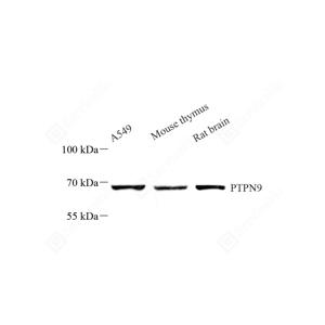 WB检测PTPN9蛋白(货号 GB114551). 样品: 经RIPA裂解液(货号G2002)处理的蛋白质. 封闭: 封闭: 3%脱脂牛奶(货号GC310001)溶于TBST溶液, 室温孵育1小时. —抗: 1: 500稀释, 4℃ 孵育过夜. 二抗: HRP标记山羊抗兔IgG (H+L) (货号GB23303), 1: 5000稀释, 室温孵育1小时. |