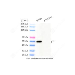 | WB检测p53蛋白(货号 GB151740). 样品: 经RIPA裂解液(货号G2002)处理的蛋白质. 封闭: 3%脱脂牛奶(货号GC310001)溶于TBST溶液, 室温孵育1小时. —抗: 1: 500稀释, 4℃ 孵育过夜. 二抗: HRP标记山羊抗小鼠IgG (H+L) (货号GB23301), 1: 5000稀释, 室温孵育1小时. |